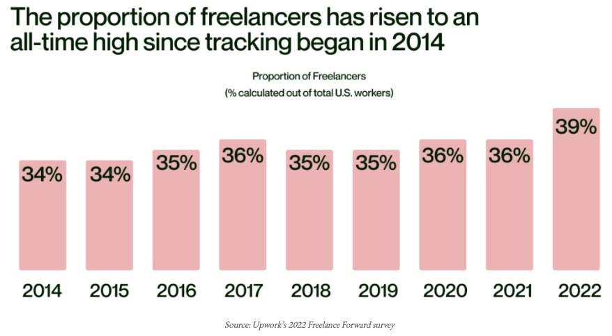 This is also matched by the growing percentage of freelancers in the US, as seen below.
